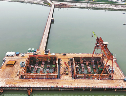 为了保持下放精度,这些液压千斤顶也并非是各自用力,而是在液压控制系统的控制下进行发力,才使钢围堰顺利下放。大桥首节双壁钢围堰成功下放入水为为大桥主墩由水下桩基施工向水上施工转换提供了有力支撑,同时也为后续施工提供了参考依据。