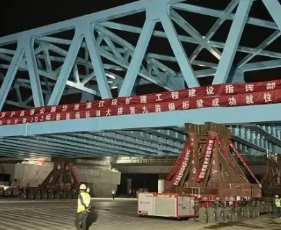 在江苏润扬集团京沪高速扩建现场,有一台智能模块车,它可以将重950吨的钢结构桥梁轻轻托起,并将其逐步移动到指定位置。