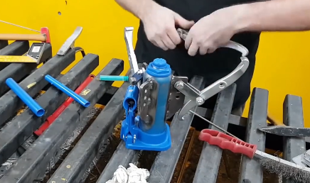 如果仔细观察的话,我们会发现,其实液压拉马和液压千斤顶的结构是非常相似的,并且都是依靠向前顶的力来完成各自不同的工作内容,只不过液压拉马利用的是液压千斤顶的反作用力,基于这点,有国外牛人突发奇想,在液压千斤顶的机身上焊接了三条钩爪,使用钩爪勾住需要拆卸的顽固部件,然后通过按压千斤顶的手柄来完成拆卸。