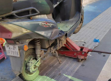 于是石家庄有位摊主就用卧式液压千斤顶顶升起摩托车,自己就能轻松展开换胎工作。这个方法比较适合更换摩托车前轮胎,前轮胎附近也有适合的顶升点,如果想要利用卧式千斤顶更换后轮胎,就要把千斤顶的顶升点向后轮胎处移动。