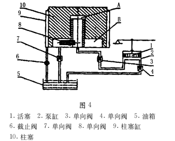 有关技术人员对传统液压千斤顶进行了改造,在柱塞内腔中还设计了一个空腔,该空腔的截面积与柱塞的截面积相近,因此柱塞在空行程段作快速上升。而与此同时,柱塞的下部与另外一个空腔的工作容积扩大,形成真空。在大气压的作用下,油箱中的液体推开单向阀流入缸中。而当柱塞的顶部接触到载荷后,腔内油液压力升高,液体推开单向阀,分两路同时进入 A 腔和缸9中,单向阀7被压力油关闭。此时该千斤顶变成传统千斤顶,与传统千斤顶在克服重物做功的效果上一样。