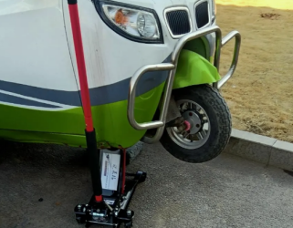 老年代步车的实用性和方便性毋庸置疑,但是有些老年代步车底盘结构、制动系统、轮胎存在一定的缺陷,容易发生故障,车辆损坏后,在维修时冠航机械建议修车人员用卧式千斤顶来顶升老年代步车。